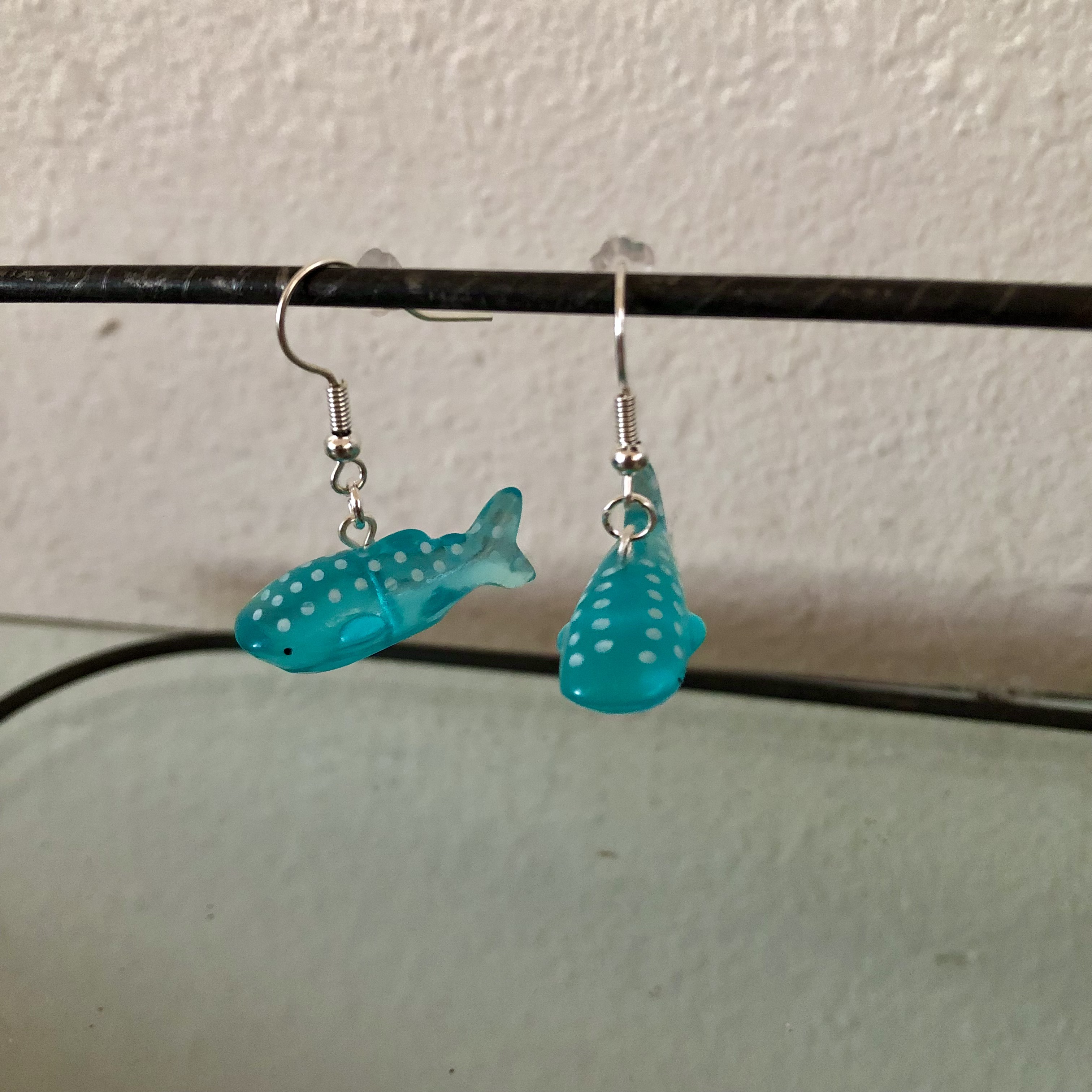 small resin mini whale shark charms have eyepin super glued in for security and are hung on silver hypoallergenic fish hook earrings!