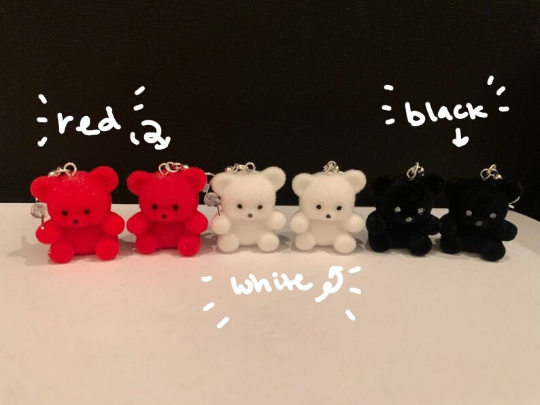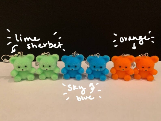 small flocked bears have eyepin super glued in for security and are hung on silver hypoallergenic fish hook earrings!