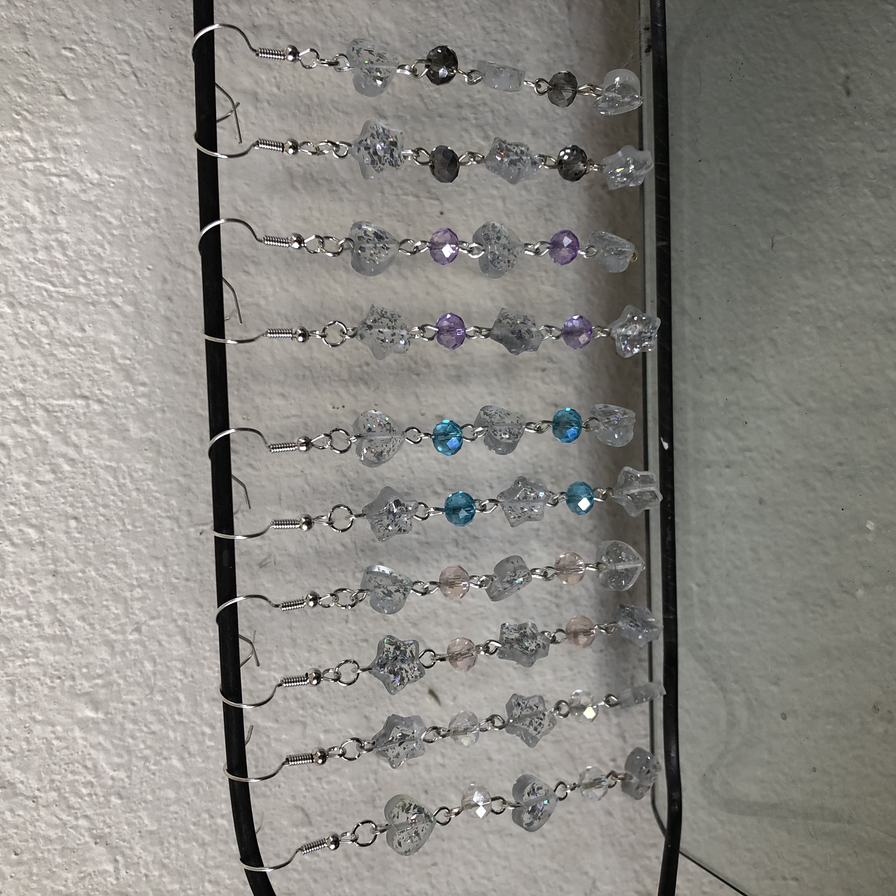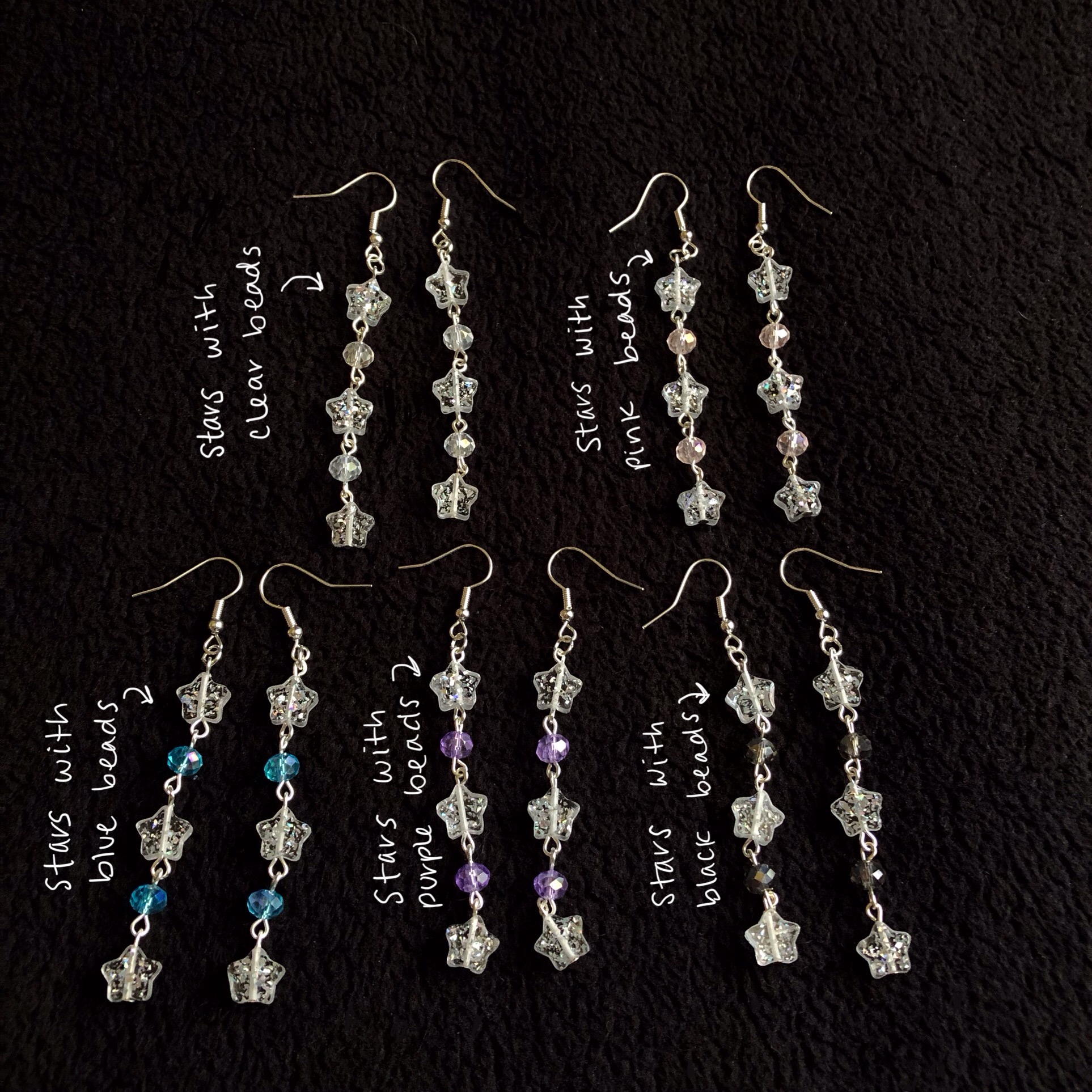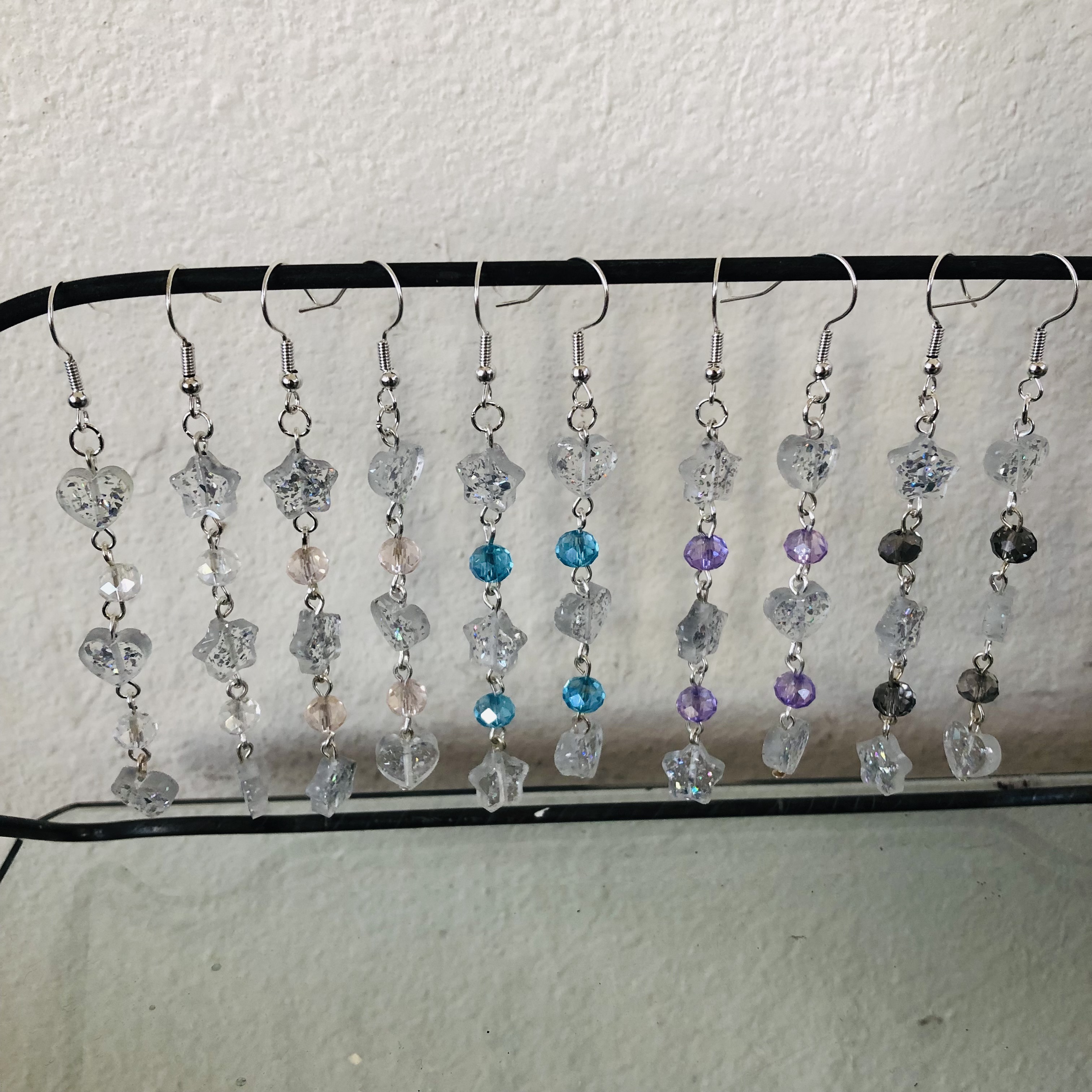 stars and glass beads are chained together with silver hardwire and a looper tool and are attached to silver hypoallergenic fish hook earrings!